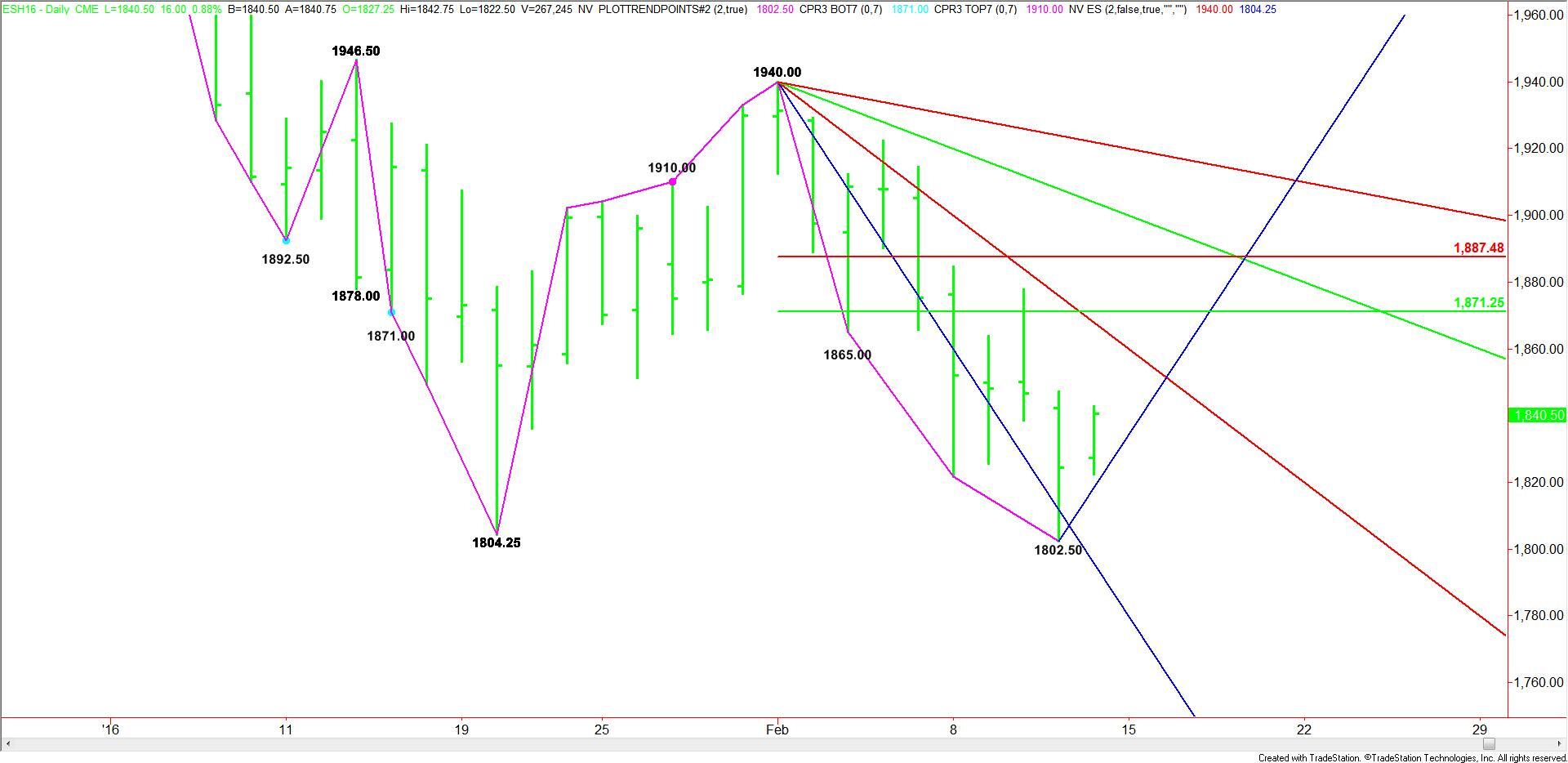 Technically, the main trend is down according to the daily swing chart. Yesterday, the downtrend was reaffirmed when the index traded below the previous bottom at 1804.25. The break stopped at 1802.50. The lack of follow-through to the downside suggests that buyers may have come in after sell stops were hit.