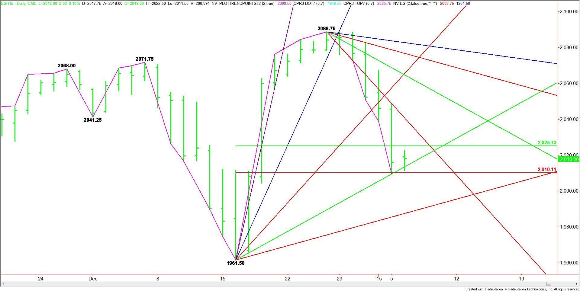 March E-mini S&P 500 Index futures begin today’s session trading inside a key retracement zone bounded by 2025.25 to 2010.00. An uptrending Gann angle from the 1961.50 bottom at 2013.50 passes through this zone, making it a valid target also.