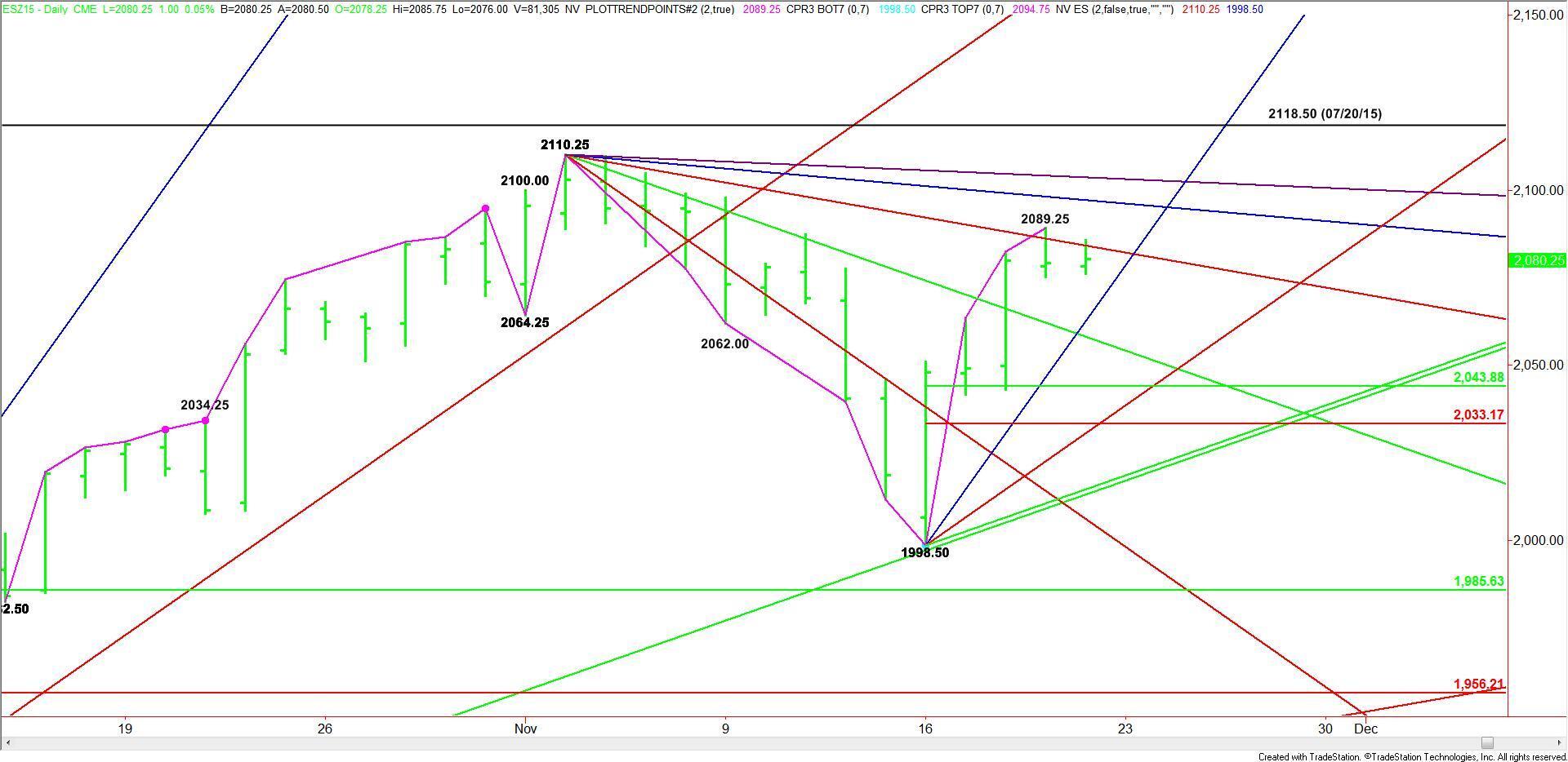 Based on yesterday’s close at 2079.25, the direction of the market today is likely to be determined by trader reaction to a downtrending angle at 2084.25.