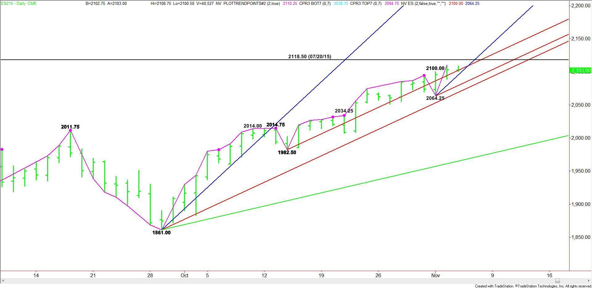 December E-mini S&P 500 Index futures inched higher on Tuesday, moving closer to the July 20 contract high at 2118.50. Although the main trend is up