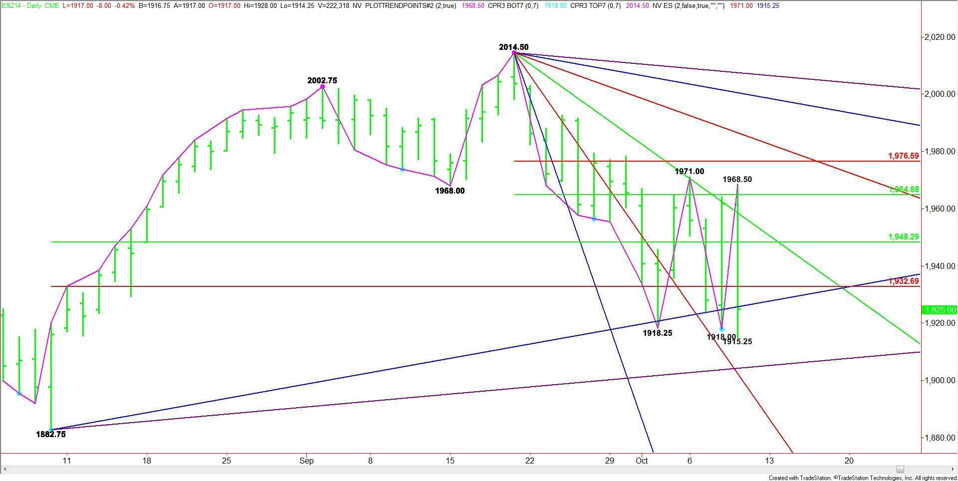 On Thursday, the December E-mini S&P 500 Index futures contract reversed back to the downside slightly above the major 50% level at 1966.25 and just short of the last main top at 1971.00. A trade through this level would have turned the main trend to up on the daily chart. The subsequent massive sell-off took out the previous swing bottom at 1918.00, reaffirming the downtrend.