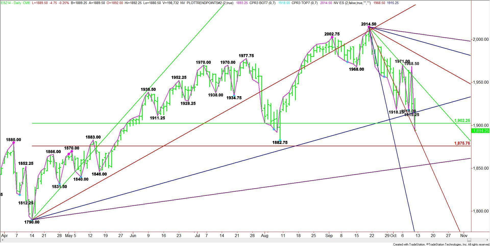 The main range is 1790.00 to 2014.50. The retracement zone created by this range is currently being tested at 1902.25 to 1875.75.