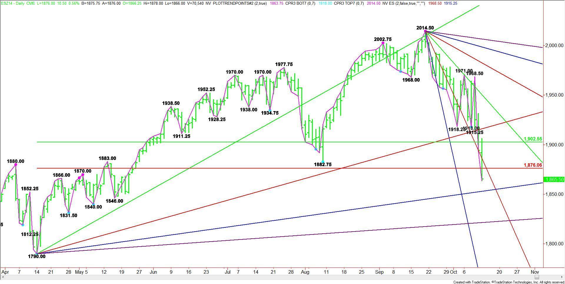 The first downside target is a long-term uptrending angle from the 1790.00 bottom at 1853.50. The daily chart indicates there is plenty of room to the downside if this angle fails with the next potential target 1821.75. This is the last major angle before the April 14 bottom at 1790.00.