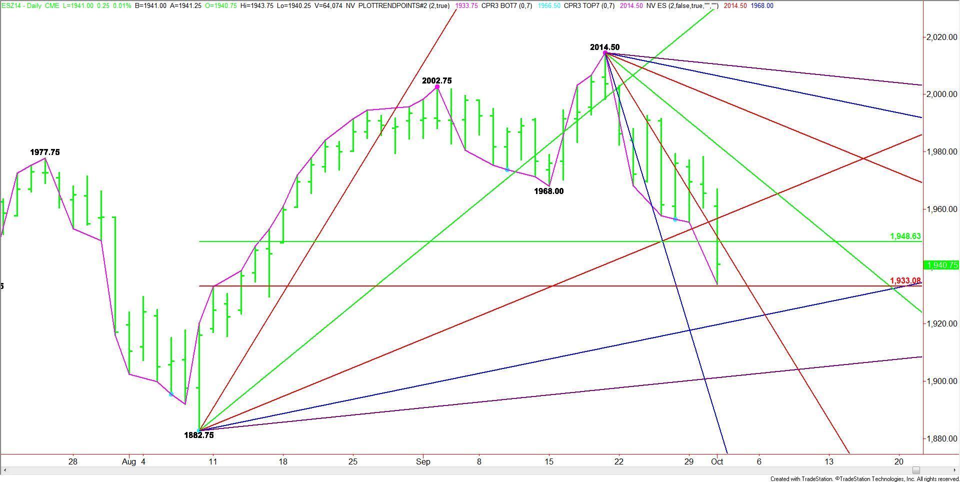 The main range is 1882.75 to 2014.50. The retracement zone formed by this range is 1948.50 to 1933.00. This primary target was hit on Wednesday with traders finding support near the lower or Fibonacci level at 1933.00.