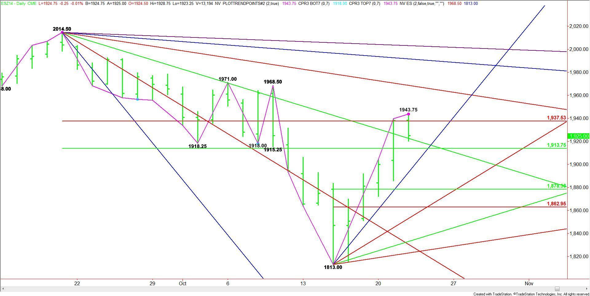A trade through 1943.75 will negate the closing price reversal top. This could trigger an acceleration to the upside with the next target a downtrending angle at 1861.00, followed by a pair of tops at 1868.50 and 1971.00.