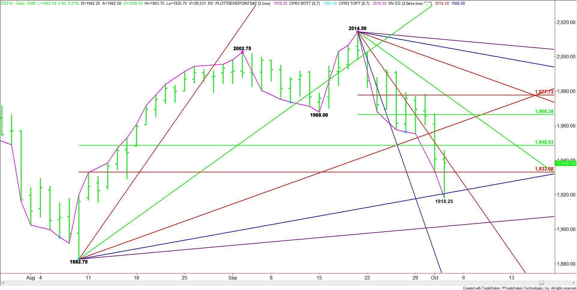 Unlike the E-mini Dow and E-mini NASDAQ-100 indices, the December E-mini S&P 500 Index futures contract took out its major retracement zone when it traded on the bearish side of the Fibonacci level at 1933.00. Fortunately, buyers were able to stop the slide when the index tested a major uptrending angle from the 1882.75.