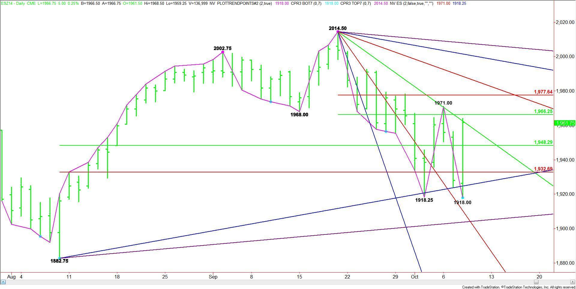 After taking out the previous main bottom by only one tick on Wednesday, December E-mini S&P 500 Index futures reversed to the upside, finishing slightly below the last swing top at 1971.00. A trade through this price will turn the main trend to up on the daily chart.