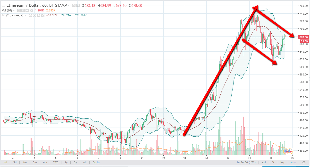 I believe that the noisy conditions in this market will continue to be a major factor, so you will have to be able to deal with this market going back and forth. That is a perfect recipe for buying the slowly, and on the dips. I would buy slowly, add slowly, and be very patient. I believe that if we break significantly below the $600 level, that would be a very negative sign, but right now I don’t think it’s going to happen. By adding slowly, you can continue to go to the upside over the longer term, and you can enjoy the uptrend without risking too much. I soon as the markets prove you crack, then you add to that position to accelerate your gains. I believe that the crypto currencies are overbought in general, and Ethereum of course is no different. However, even bubbles go longer than people anticipate.