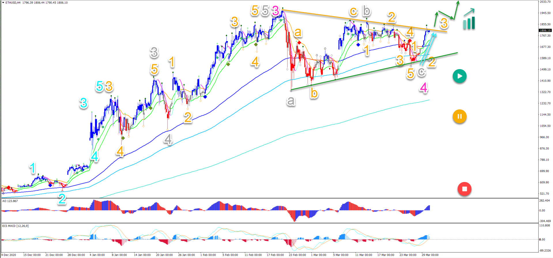 Ethereum (ETH/USD) cryptocurrency made a bearish ABC correction (grey). This occurred after completing a strong surge higher within a wave 3 (pink).