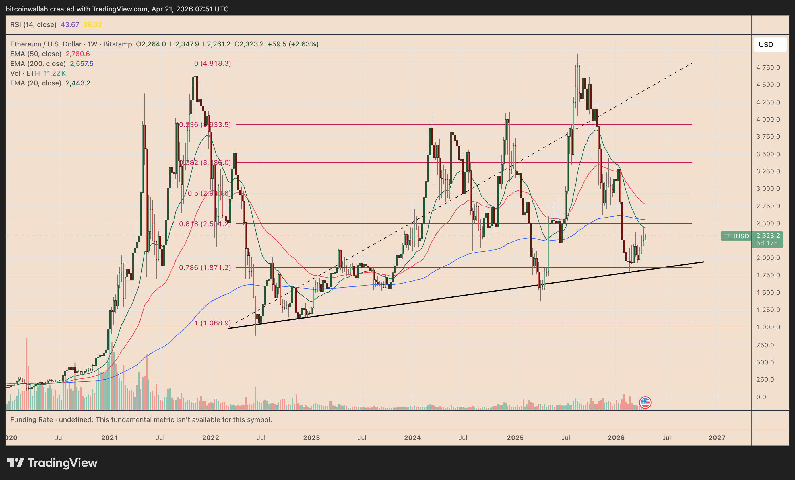 Technically, ETH has already responded. The price rebounded after testing its multiyear ascending trendline support, a level that has historically marked cycle bottoms. It now trades near $2,324 on the weekly chart, with momentum building.