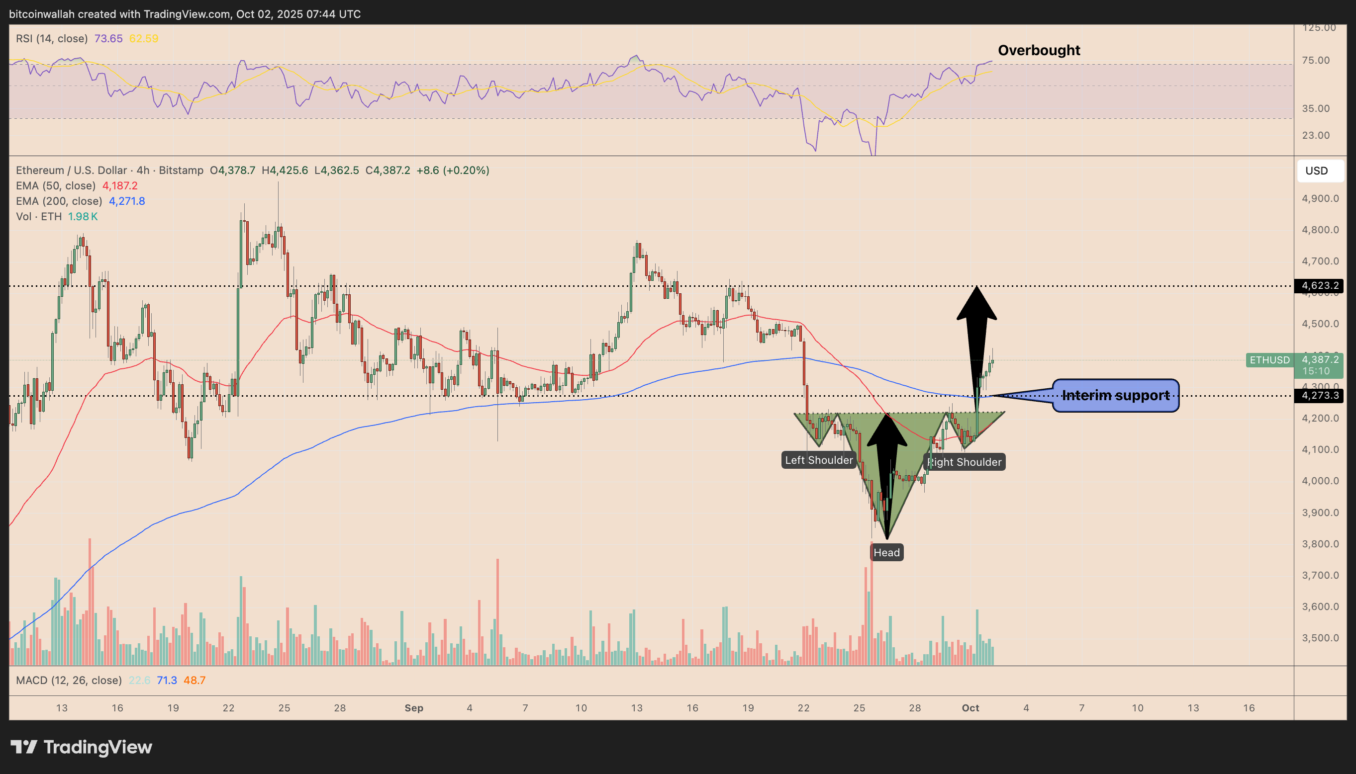 As long as ETH holds above the 200-period EMA, bulls remain in control, and the pattern’s measured move points toward $4,600 as the next upside target. A decisive close above that level could open the doors to further rallies in October.