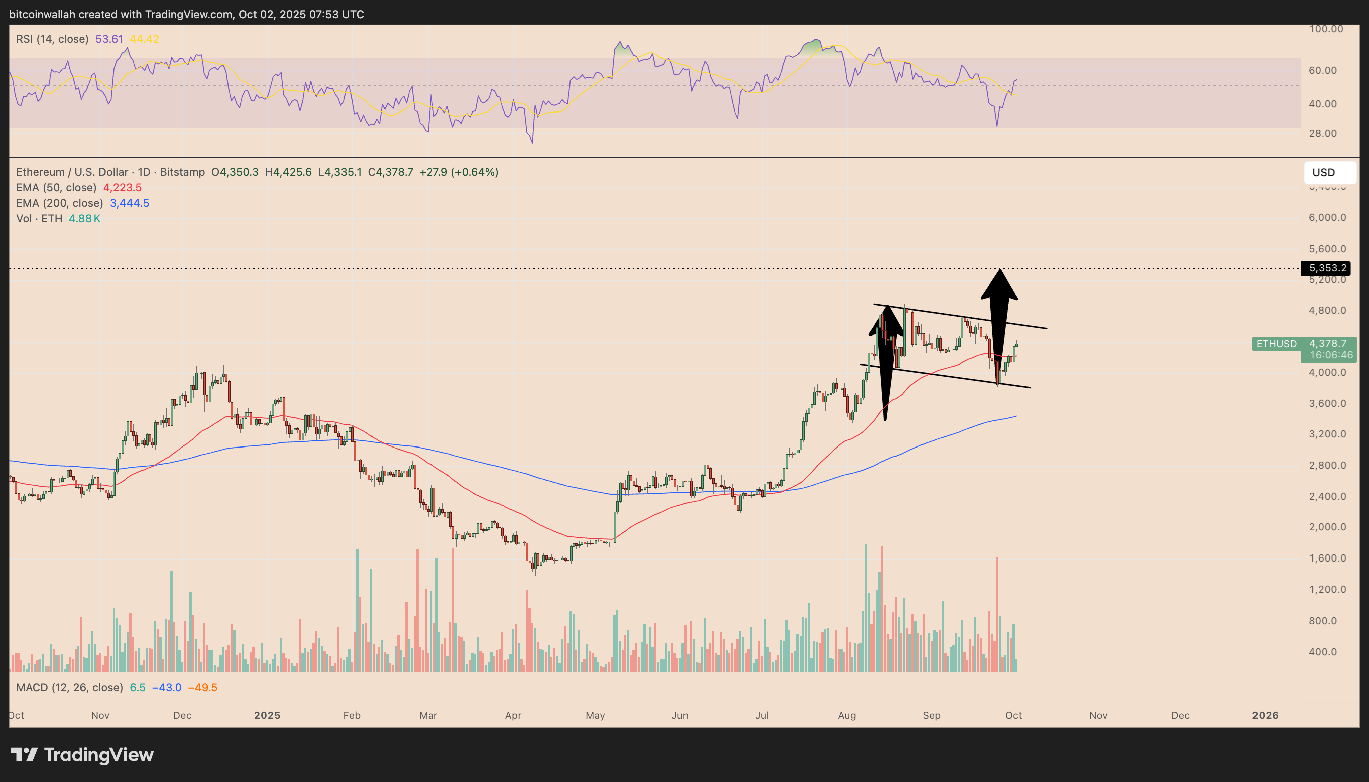 Ethereum’s native token, Ether (ETH), has kicked off October on a bullish note, climbing nearly 6.75% in the first two days of the month to trade above $4,380 on Thursday.