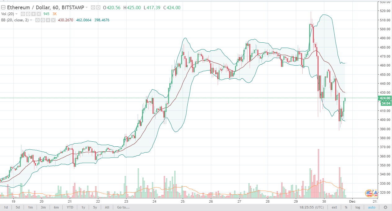 Ethereum fell again during the trading session on Thursday, reaching as low as $390. The $400 level offered a bit of support and the range as you can see has held the significantly. We have bounced $25 from there, but given enough time I think it’s only a matter of time before we roll over again. If we did break above the $460 level, then I think the market probably goes higher. It’s not until then that I am comfortable buying this market, because quite frankly Bitcoin looks as if it is still likely to find some selling pressure. In general, the markets will continue to look at lower levels, perhaps down to the $370 level underneath. That level is much more supportive, and could be a place where we form a bit of a base. I think that the psychological troubles of breaking above the $500 level could continue to be an issue for the market as this type of vicious selloff will have scared a lot of traders.