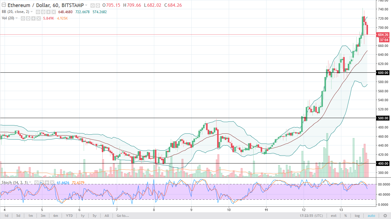 Ethereum continues to be very volatile, having a very strong open during the session on Wednesday, but has rolled over a little bit as the $700 level may be proving itself a bit too far ahead of the game.
