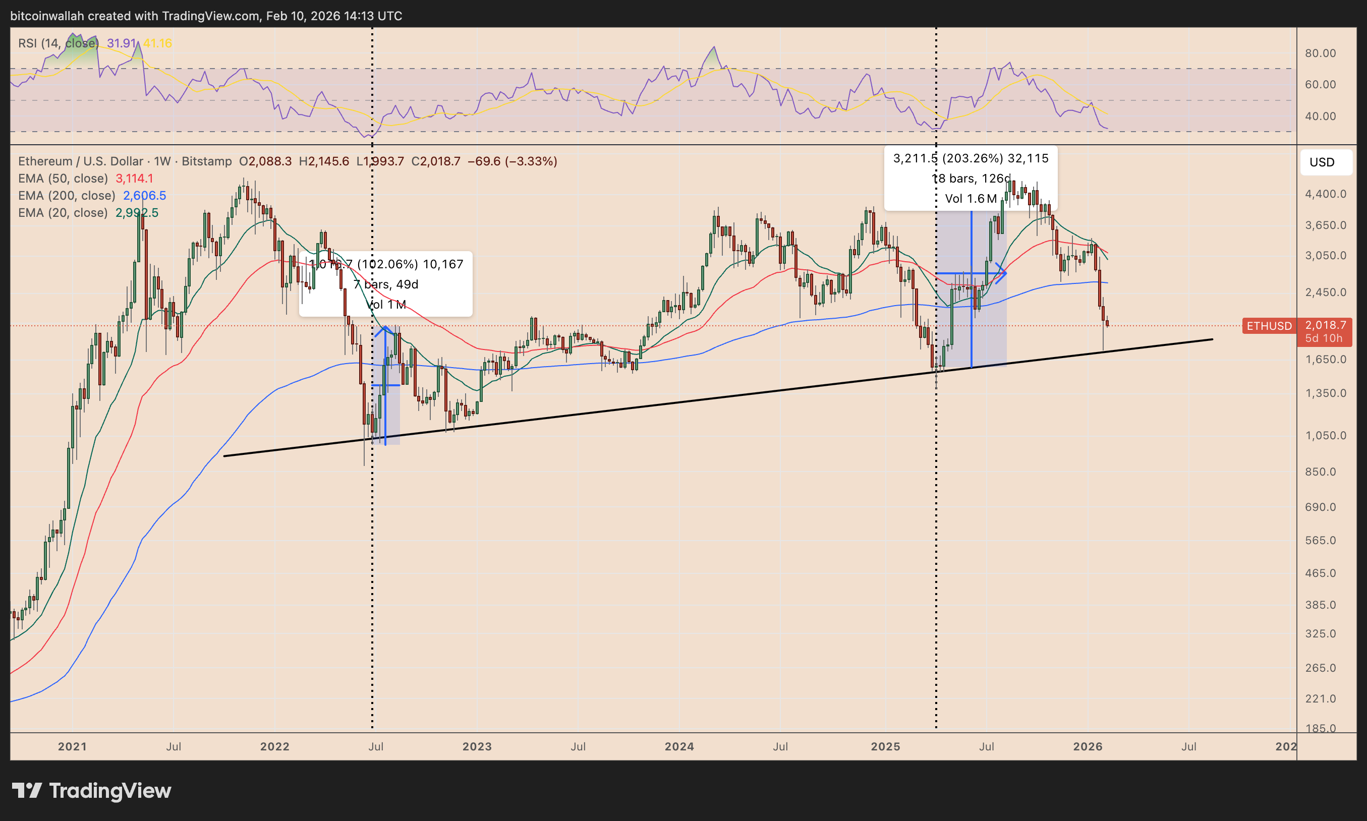 On the weekly chart, ETH has returned to a rising long-term trendline that has defined its broader bull-market structure since 2022.