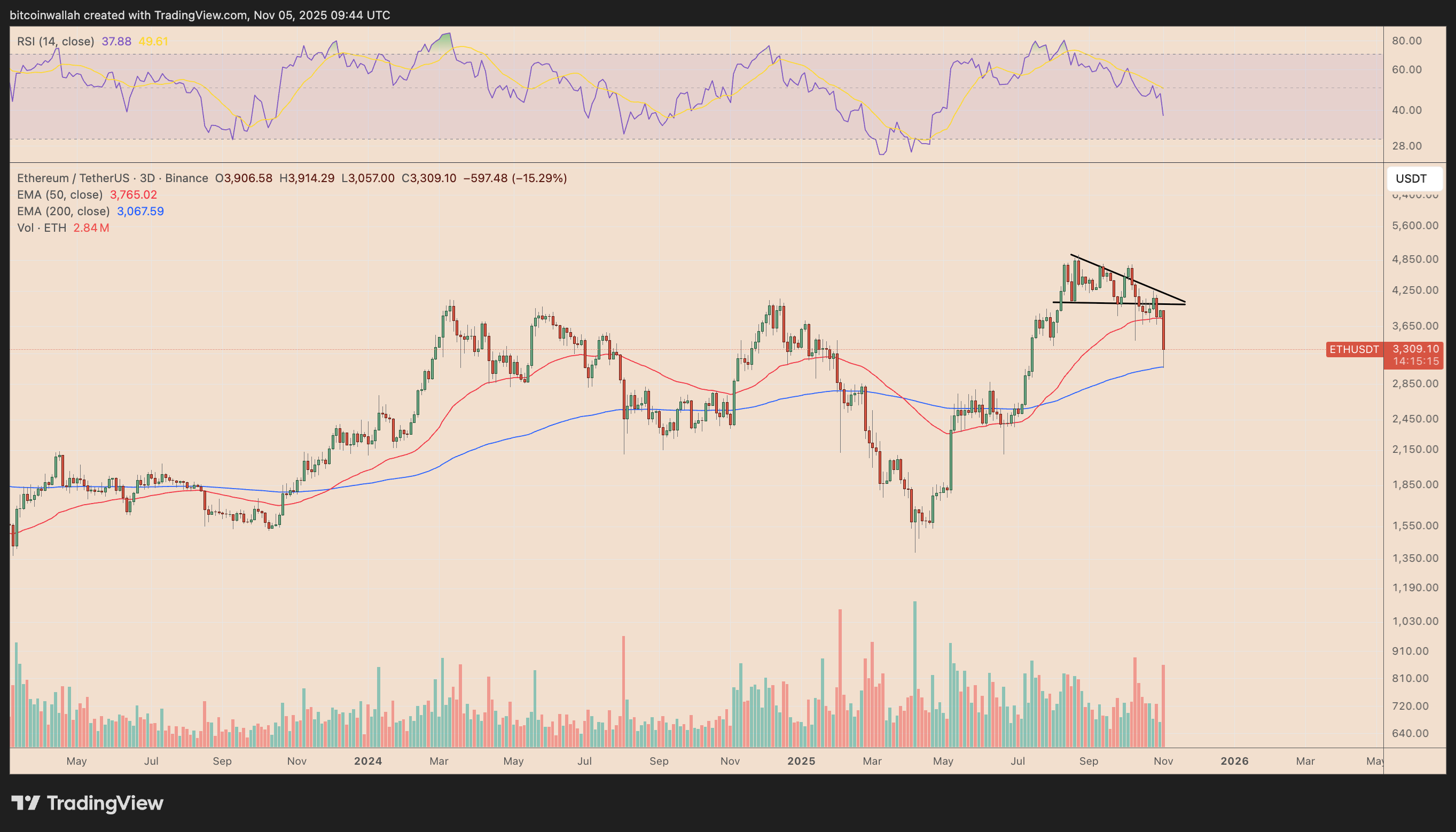 That would align with the technical scenario of a bounce toward the $3,700–$3,800 area—the confluence of the 50-EMA and a descending trendline resistance visible on the 3-day chart.