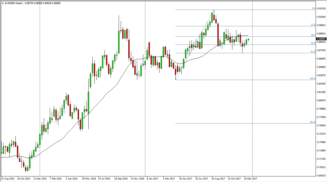 The EUR/GBP pair initially fell during the week, but then turned around to form a hammer. The hammer of course is a bullish sign, and I think that we will continue to see buyers jump into this market place, perhaps reaching towards the top of the overall consolidation at the 0.90 level. A break above that level is extraordinarily bullish, but I think we are probably not going to see that quite yet, especially considering that we have negotiations to go through between London and Brussels. Ultimately, I think that we will eventually see the market break out to the upside, but we need to get through the negotiations before traders are comfortable enough to get involved. Once we break above the 0.90 level, it’s likely that we will go looking towards the highs of the year, near the 0.93 handle. The alternate scenario is that we would breakdown, but it’s not until we sliced through the 0.87 level that I would be concerned about the move higher as we have seen the 61.8% Fibonacci retracement level hold at that level.