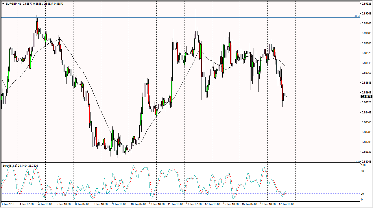 The EUR/GBP pair initially tried to rally during the trading session on Wednesday, and as you can see it’s likely that the traders are starting to look at this as a slightly oversold condition based upon the stochastic oscillator that is crossing in the oversold condition on the one-hour chart. I think that we will probably bounce towards the 0.89 level, but I recognize there is a significant amount of resistance in that area. If we do break above there, the market then goes looking towards the 0.90 level, as it gives us an opportunity to fulfill the range of the longer-term consolidation that this pair has been in.