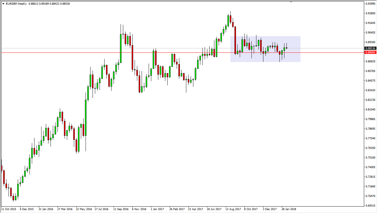 The EUR/GBP pair has gone back and forth during the week again, ultimately ending up with a shooting star. It looks as if the market is dancing around the 0.88 handle, so I think at this point we will probably drift lower, only to find buyers underneath.