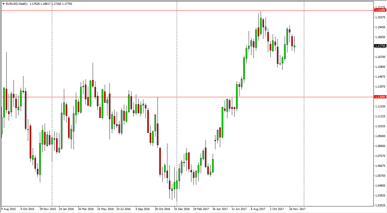 When I look at the longer-term weekly chart, I clearly see a bullish flag, which I suspect most of the world does as well. Because of this, I think it’s only a matter of time before the buyers come back in and pick this market up, but with the market forming a shooting star of the last week, I think we may need to pull back to find the necessary momentum. I anticipate that somewhere near the 1.15 handle underneath should be an opportunity for people to look at this market in a value-oriented fashion, and at that point I would anticipate that plenty of buyers will return. Alternately, if we break above the top of the shooting star candle for the week, then that would be a very bullish sign as well. I think there are a lot of concerns about the US tax bill, and we don’t know exactly which way that’s going, or if it will even be done between now and the end of the year. Right now, I suspect it’s only a matter of time before they sign something, but this of course is speculation.