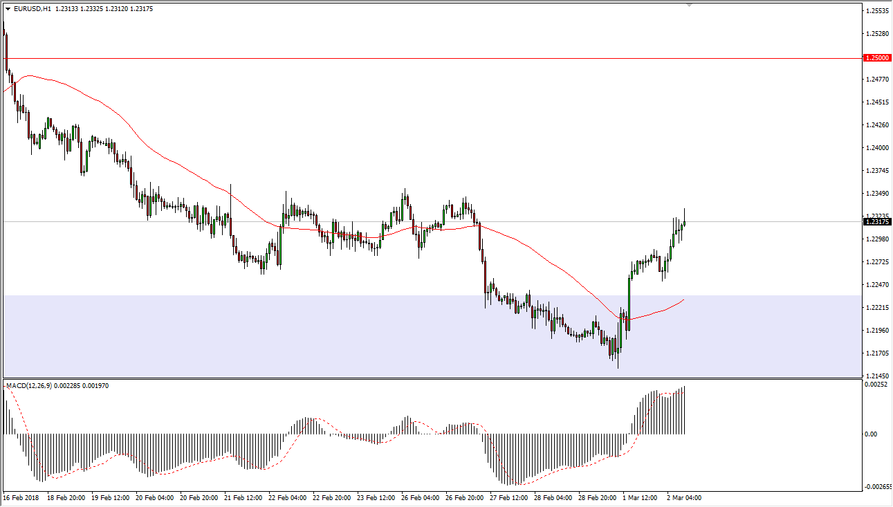 The EUR/USD pair has rallied on Friday, reaching towards the 1.23 handle. As the world continues to react to steel and aluminum tariffs coming from the United States, it will be interesting to see how the US dollar goes.