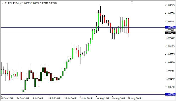 The EUR/CHF pair fell during the course of the session on Friday, but we still remain well within the consolidation area that we have been in for some time. Ultimately, we feel that the market should bounce from here, perhaps heading towards the 1.09 handle. We have been consolidating between the 1.07 level on the bottom and the 1.09 level on the top recently, and at this point in time we feel that will continue to be the case going forward. That being said, we still have an upward bias over the longer term, as the Swiss National Bank continues to work in favor of this pair going higher.