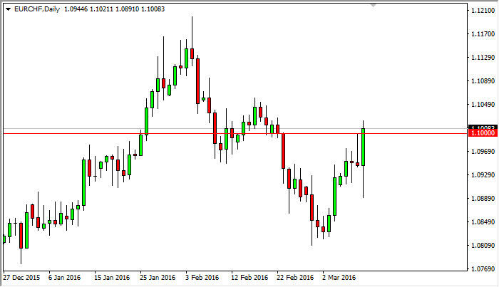 The EUR/CHF pair initially fell during the day on Thursday, dipping all the way down to the 1.09 region. We found enough support there to turn things around though that we formed a very bullish candle. This complete reversal was of course a very strong sign, but on top of that we have broken well above the 1.10 level, and that means that we have broken above a large, round, psychologically significant number. This is also a number that I have been looking at quite a bit in the recent past as it seems to be a bit of a magnet for the market.