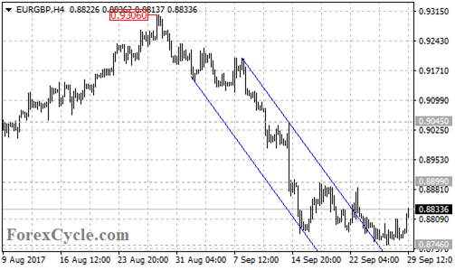 EURGBP recently broke out of a price channel on its 4-hour chart and moved sideways in a trading range between 0.8746 and 0.8899, suggesting that consolidation for the bearish movement from 0.9306 is underway.