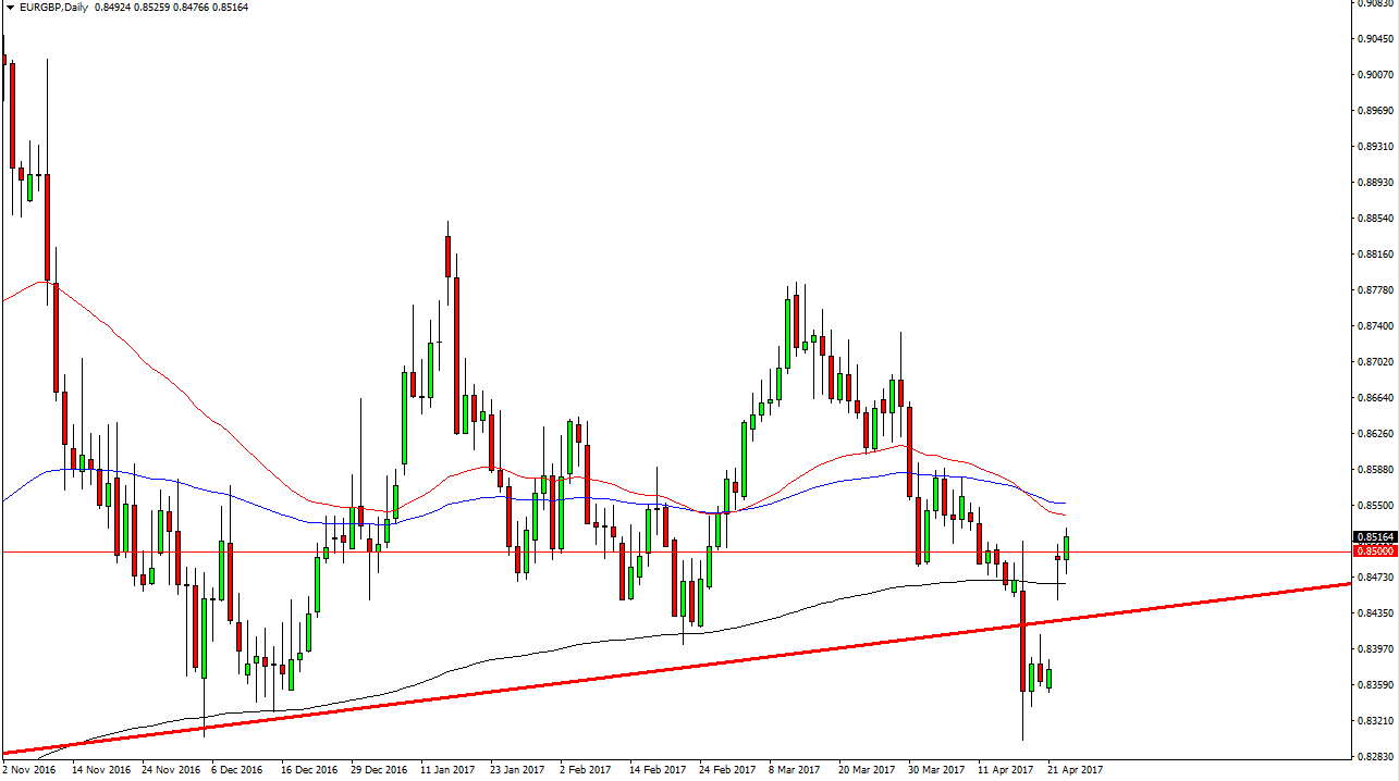 The EUR/GBP pair initially fell on Tuesday, but found enough bullish pressure to break above the 0.85 level. Because of this, it looks as if the market is