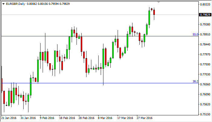 The EUR/GBP pair fell a bit during the session on Monday, but found a little bit of support to form a hammer-like candle for the day. The candle is of course positive, and a break above it would be a good sign for a move higher. The market should then continue to the 0.80 after that. We also believe that the market will show a lot of support at the 0.79 level. The Euro will continue to be favored over the Pound at the moment, as there are concerns about the UK leaving the EU.