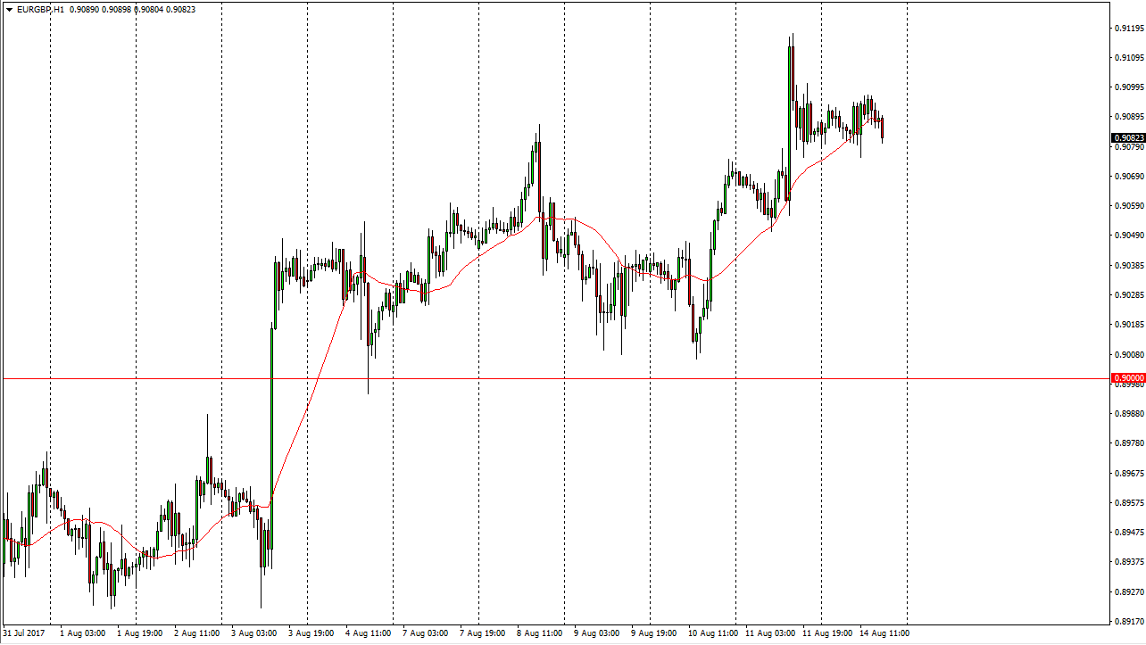 The EUR/GBP pair did almost nothing during the day on Monday, as we continue to drift into the 0.91 handle. I believe that longer-term this market is