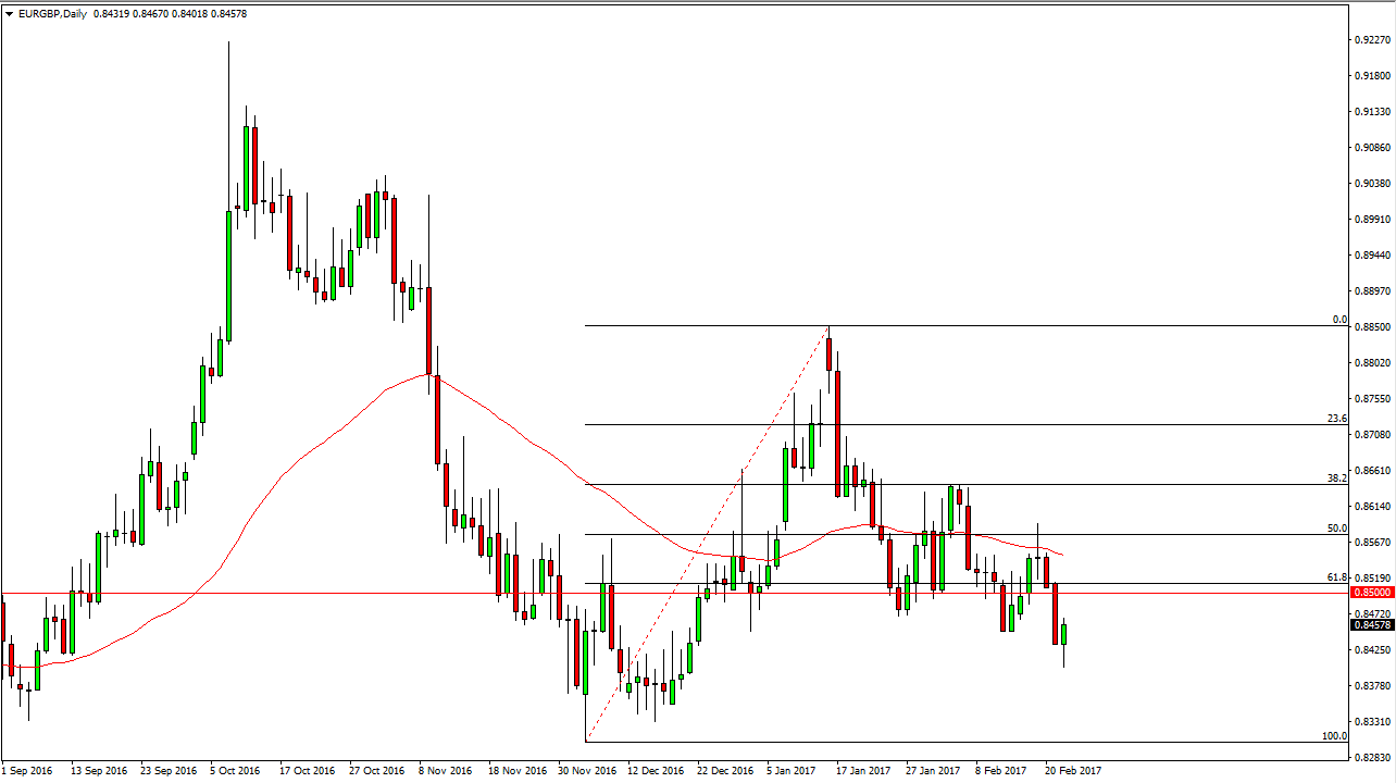 The EUR/GBP pair initially fell on Wednesday, but found enough support to turn things around to form a hammer. The hammer of course is a bullish sign, so I think we could get a bit of a bounce from here. However, we are starting to make lower lows, so I believe that somewhere near the 0.85 level should be resistive action just waiting to happen, and I will be a seller when it happens. Alternately, if we can break down below the bottom of the candle for the session on Wednesday, I think that the market will then reach to the 0.83 level below. I don’t have any interest in buying.