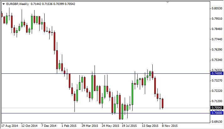 The EUR/GBP pair fell significantly during the course of the week, forming a very negative candle. We tested the bottom of the hammer from the previous week, and we are sitting just above the 0.70 level. Because of this, we think there is a significant amount of support in this area so it can be difficult for us to place any longer-term trade. We would need to break down below the 0.69 level in order to start selling from here, but we certainly have no interest in buying. We could perhaps see a bit of a bounce that gives us an opportunity to short this market again, and at this point in time we have no designs on placing money in this market.