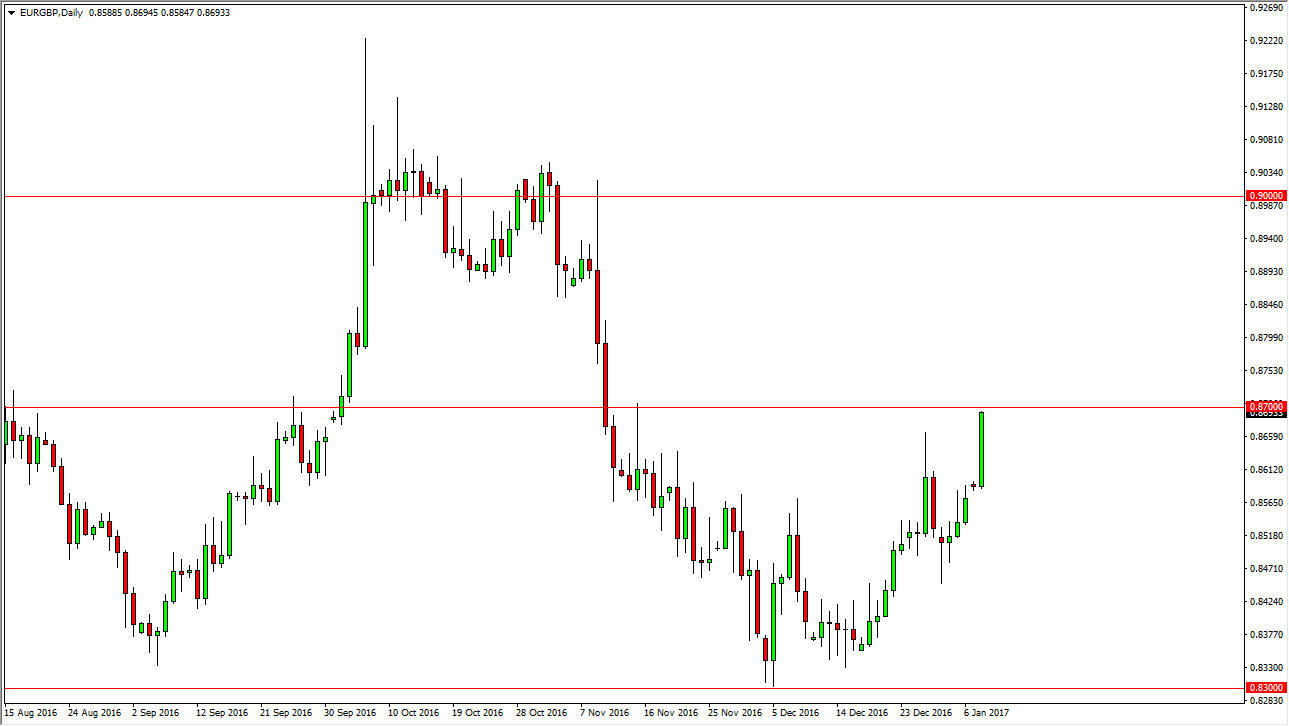 The EUR/GBP pair is testing a major resistance barrier in the form of the 0.87 level above, which breaking that would of course be a very bullish sign. At that point, I would anticipate that the market would then reach towards the 0.89 handle, and even possibly the 0.90 level. An exhaustive candle in this area would be an excellent selling signal, but we need to see that happen on the close of the daily chart in order to take that signal seriously. In the meantime, standing on the sidelines and waiting for clarity is the best way to deal with this type of action.