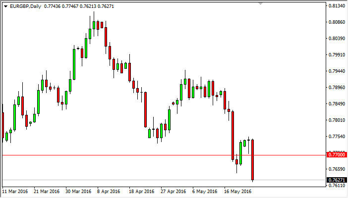 The EUR/GBP pair broke down during the course of the session on Tuesday, making a fresh, new low. Because of this, and the fact that we have broken down below a couple of hammers, it looks as if we are ready to fall apart. At this point in time, we have a target of 0.75, and believe that the sellers will go looking for that area. Short-term rallies that show signs of exhaustion should be nice opportunity start selling. The candle is very long, and that of course signals that there is real conviction in the selling pressure.