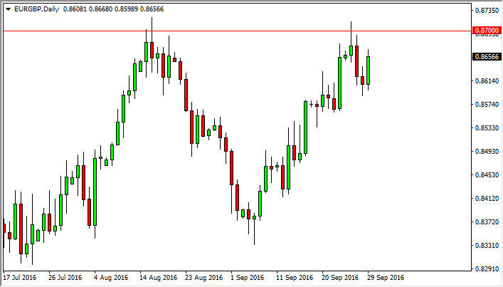 The EUR/GBP pair broke higher during the course of the day on Thursday, clearing the top of the Wednesday candle. It looks as if the market is trying to test the 0.87 level, which has been so massively resistive. At this point in time, I believe that the market will find buyers every time it dips, and that’s exactly how and going to play this market, buying on the dips. I think that eventually once we break above the top of the shooting star from earlier this week, the market will then start to work towards the 0.90 level above.