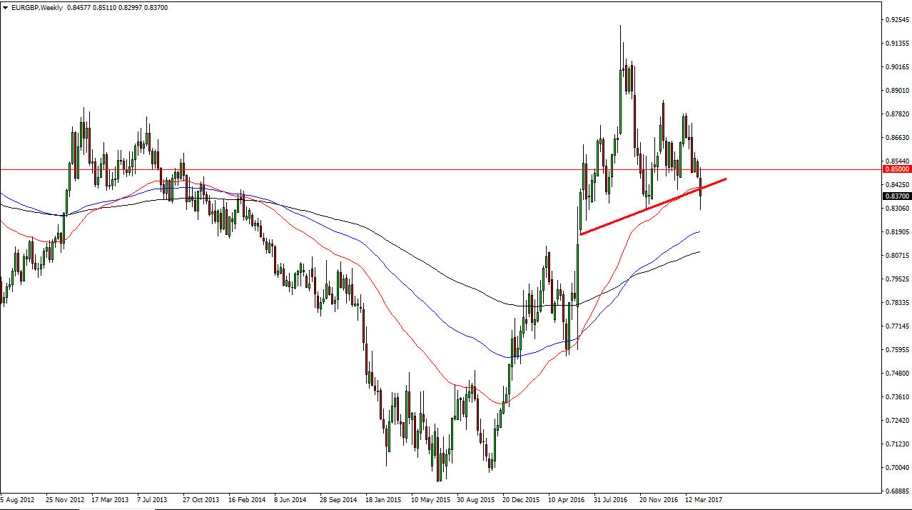 The EUR/GBP pair broke down during the week, after initially trying to rally through the 0.85 handle. Now that we have broken down below this level significantly, I believe that it’s only a matter of time before we break down even further. This will be especially true if the French elections go and more of an anti-EU direction, which very well could happen. The British pound has exploded to the upside in general, and I believe that will continue to weigh upon this pair. Buying isn’t even a thought.