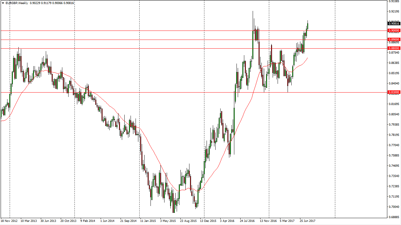 The EUR/GBP pair has broken above the 0.90 level during the week, showing signs of a continuation of the longer-term uptrend. I believe that the market