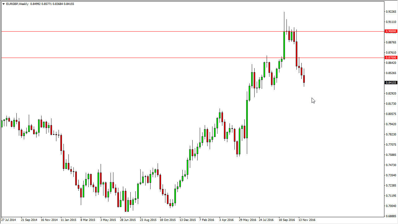 The EUR/GBP pair initially tried to rally during the week, but turned around to form a negative candle. Because of this, the market looks as if it is going to test the 0.8350 level underneath, and if we can break below there the market could go much lower. Rallies now would be suspicious at best, and I would be more than willing to sell exhaustive candles above. It’s not until we break above the 0.87 level that I would be comfortable buying this pair at this juncture going forward.