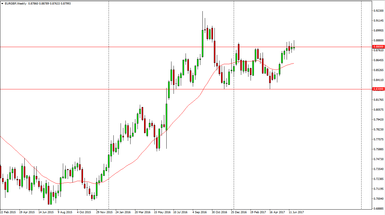 The EUR/GBP pair initially tried to rally during the week, but turned around to form a shooting star at the 0.88 handle. The market looks as if it is