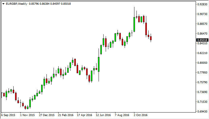The EUR/GBP pair had a slightly negative weak, as we continue to grind lower. At this point, I’m expecting this market to test the 0.8350 level below. Any