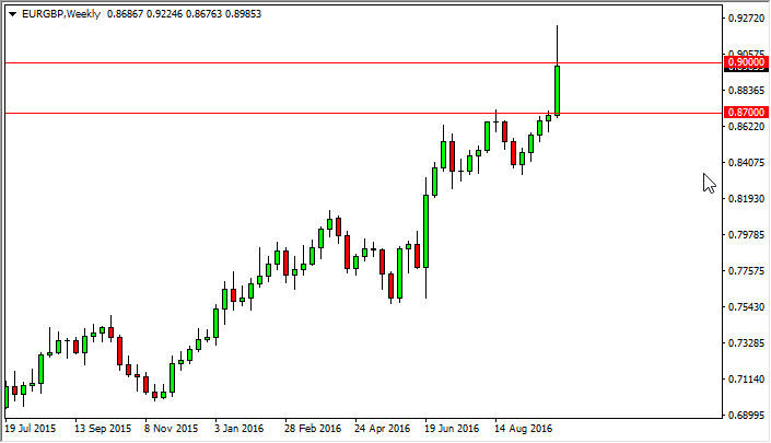 The EUR/GBP pair broke higher during the course of the week, slicing through the 0.90 level. However, that area did offer a bit of resistance, so with that being the case it’s likely that the market will have to back up a little bit in order to continue going long. I believe that the 0.87 level below is supportive, and as a result it very likely that pullbacks will be considered to be value buying the marketplace, and as a result I have no interest in selling this market at this point in time.