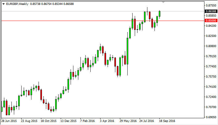 The EUR/GBP pair rallied during the course of the week, testing the highs yet again. I believe that we are trying to go higher, but we may have to pull