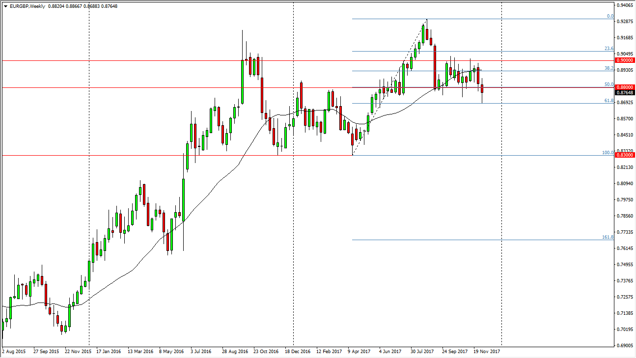 I believe that the volatility continues, but the uptrend is still intact, and I believe nothing has changed overall. I think between now and the end of the year, we should see a lot of choppy back and forth type of trading action, perhaps making it a bit difficult for longer-term traders who are not of the “buy-and-hold” attitude. Ultimately, I think that a small trading position in a range bound trading system is probably the best way to play this market, but longer-term I would anticipate that the buyers should win the day. If we do break down below the hammer from the weekly candle though, at that point I would not only be short, but I would be aggressively short, expecting the move down to the 0.83 handle. I would be very surprised if we can break down below that level.