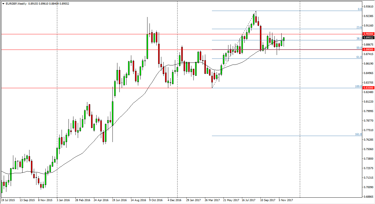 The EUR/GBP pair continues to be very volatile, bouncing around in a tight range yet again. It looks as if the 0.88 level underneath is going to continue to be supportive, while the 0.90 level above is resistance. The weekly candle is a bit of a hammer, and if you look at the bodies of the candles over the last several weeks, you can see that the market is forming a basing pattern, or what is sometimes called a rounding pattern. If we can break above the 0.90 level, the market should continue to go higher, perhaps reaching towards the 0.93 level after that. That area has caused quite a bit of resistance in the past, but I think that we will eventually go looking towards that, as we have found significant support at what would be the 50% Fibonacci retracement level from the larger move to the upside.