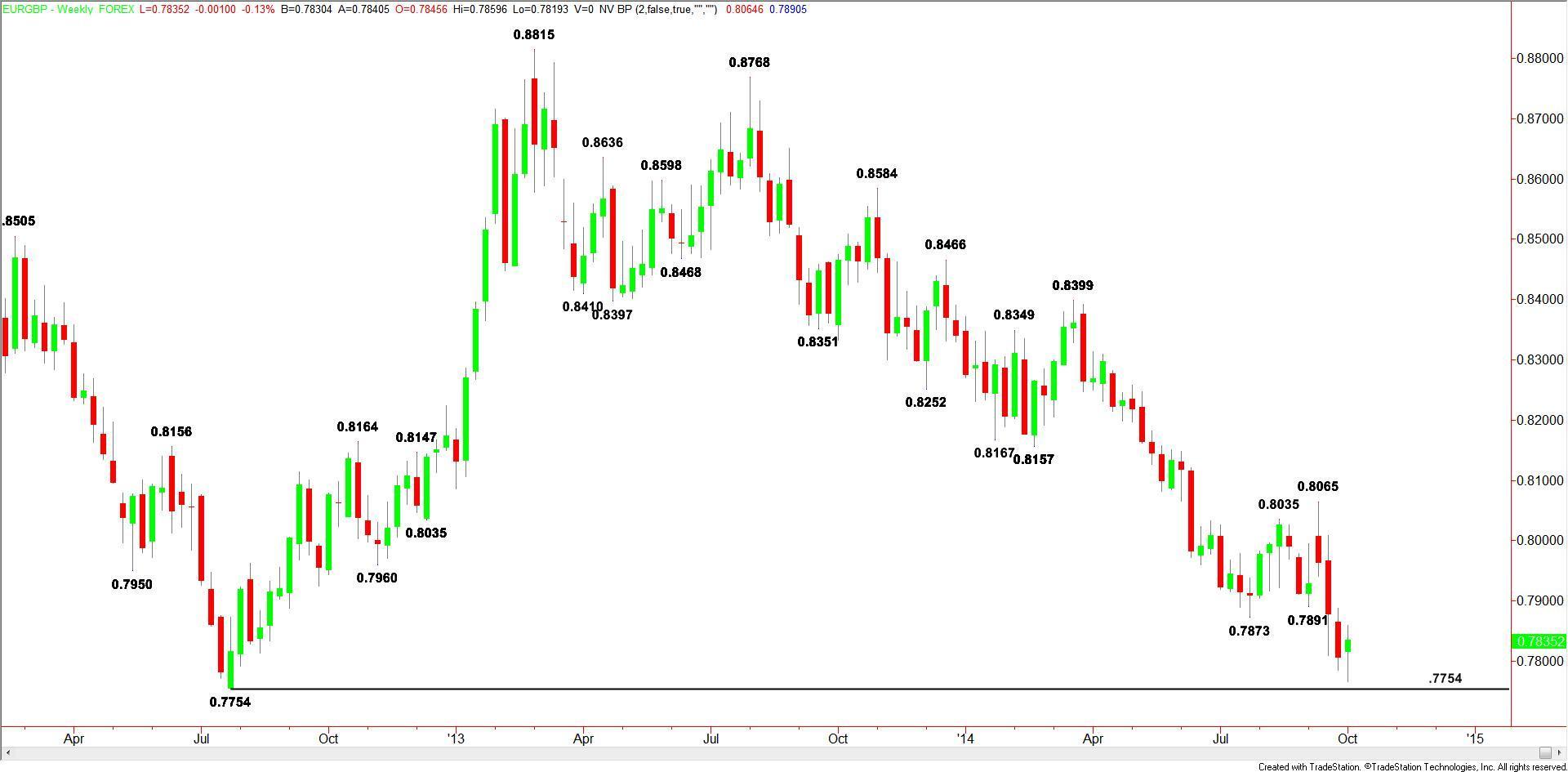 The EUR/GBP posted a gain on the weekly chart for the first time in three weeks. Buyers came in to support the Forex pair as it approached the July 2012 bottom at .7754. It may have been a combination of profit-taking, short-covering and aggressive counter-trend buying that produced the reversal to the upside.