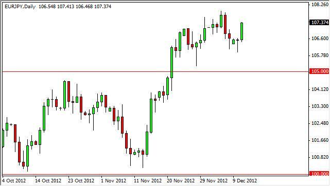 The EUR/JPY pair shot straight up like it was fired out of a cannon on Tuesday. The Monday hammer signal that perhaps the 106 level was going to offer plenty of support, and was proven correct during the trading day on Tuesday. With this being said, we are also closing at the very top of the session, and as a result it does look like this market wants to go much higher. Because of this, we are buying pullbacks as they come, as well as breakout. As far as selling is concerned, we have no interest in doing so until we break down below the 105 handle.