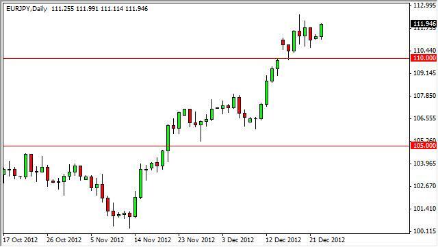 The EUR/JPY pair shot straight up during the session on Monday, even though we had very low volume. Looking at this pair, it is obvious that the 112 level offers resistance going forward, and is the next hurdle to overcome. We do believe that this market will continue higher, and also see the 110 level as massive support. Because of this, we think buying on shorter time frames will be the way to go as the market dips. We believe eventually we break out to the upside at 112, and as such we are perfectly comfortable going long here or using shorter time frame charts that show the slightest hint of support in order to go forward.