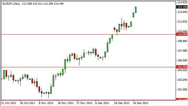 The EUR/JPY pair shot straight up during the Thursday session again as we continue to climb in a parabolic manner. The Bank of Japan is sent to start bashing the Yen in the near-term, and as a result the Yen is falling against pretty much everything in the marketplace. With this being said, if you are not long of this pair already, buying at this point time would simply be “chasing the trade.” This is without a doubt one of the most dangerous ways to trade, and almost always ends up and losses.