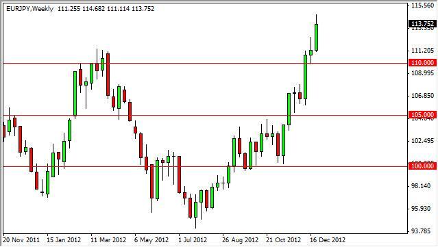 The EUR/JPY pair had a strong showing this week as we managed to close well above the 113 level. The 115 level was the initial target, and we fell just